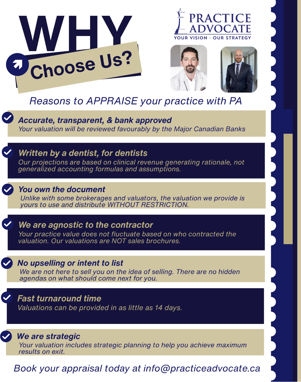 These 8 questions are questions you deserve answers to before you sign with your chosen appraiser. Just like dentists, there are many appraisers to choose from. Below are our answers to those questions. If you’re at an inflection point in your career, we want you to be as informed as possible. Reach out today and we’d be pleased to hear about what you want your future to look like.